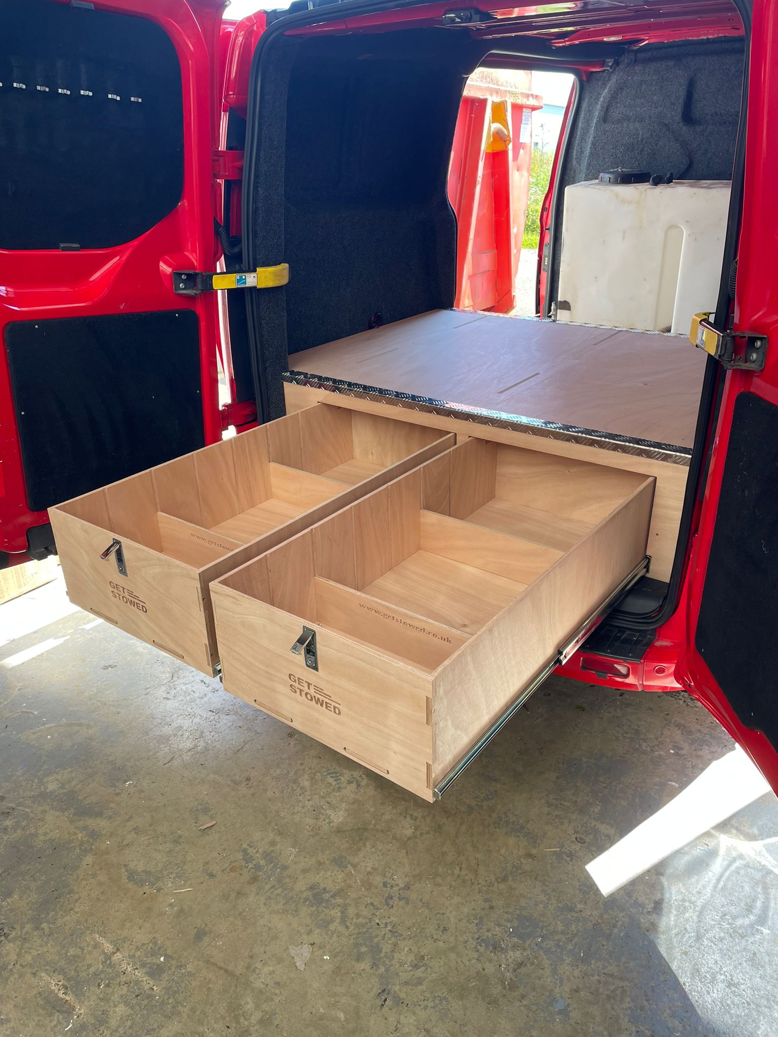Made of sturdy 12mm moisture resistant ply with a chequer plate edge, this discrete unit is designed to be hard to spot through the vehicle windows. Features two pull out drawers with lockable latches.  Each drawer comes with 2 adjustable half height dividers (additional half height dividers and full height dividers can be ordered separately).