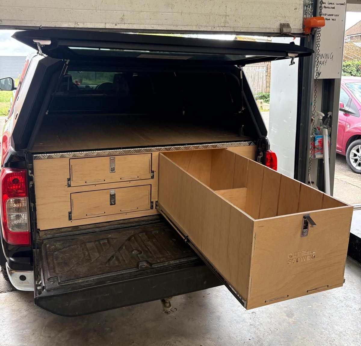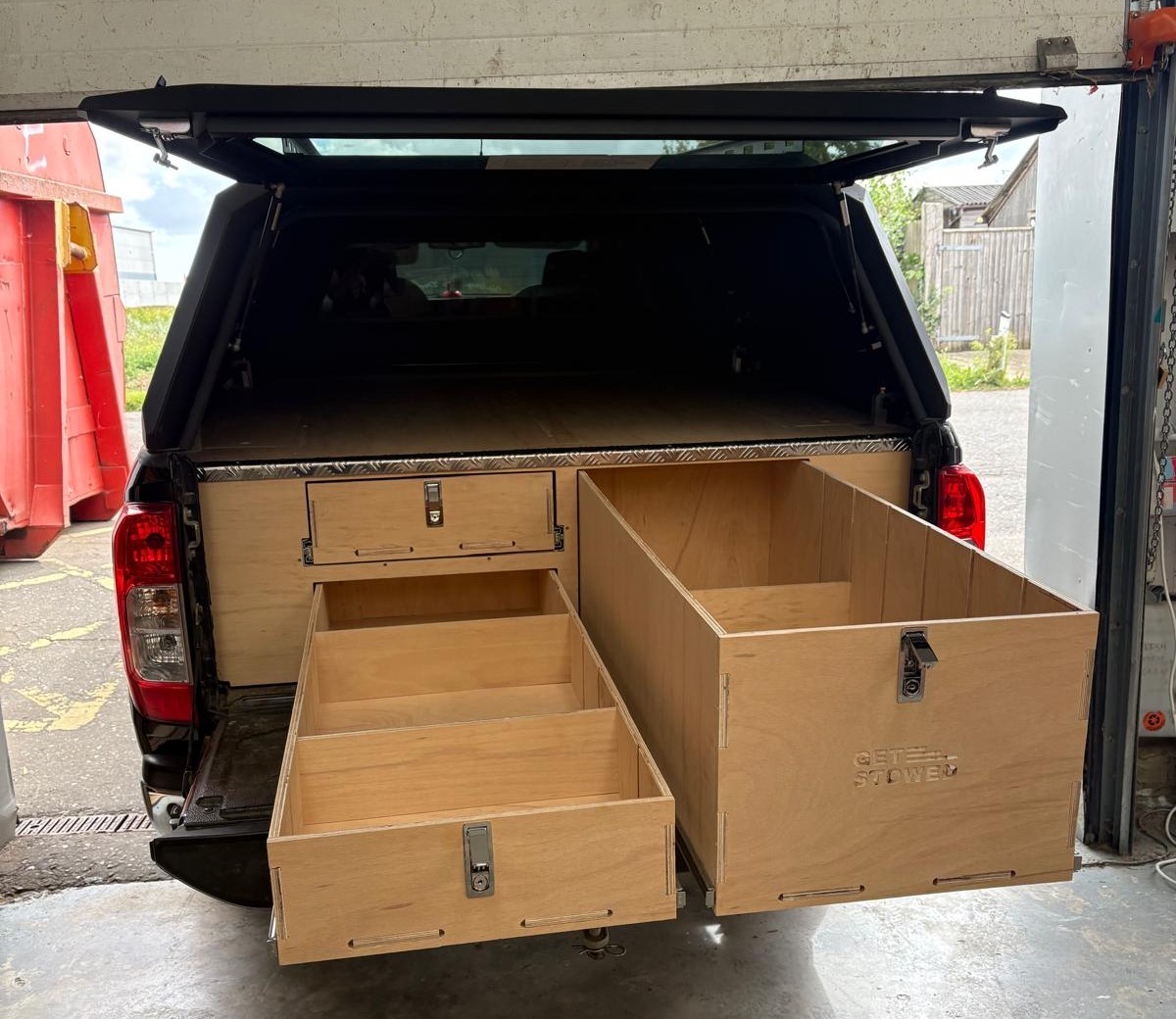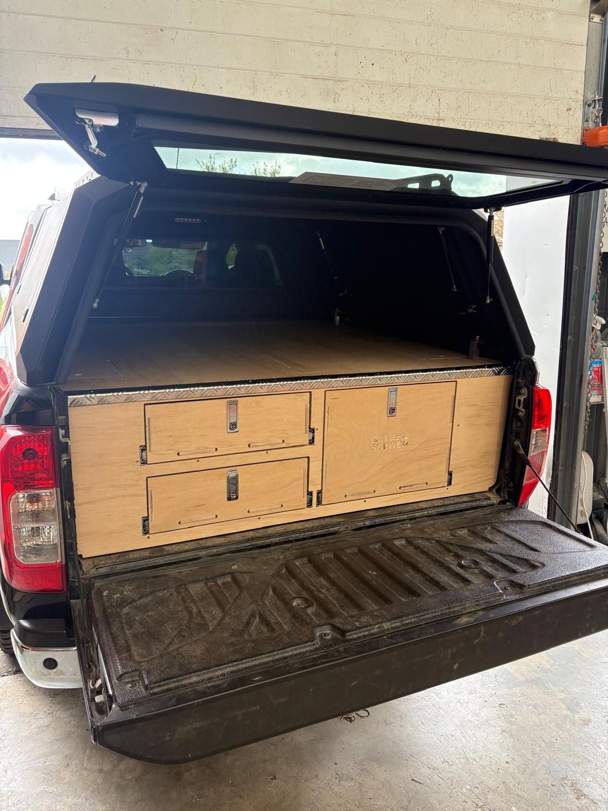 Designed and manufactured by Get Stowed in the UK, our truck storage systems are fitted without any fixings to your vehicle and can be removed later on if necessary. Our units are designed to be fitted into vehicles with a canopy. The canopy doesn’t need to be removed to fit the unit.